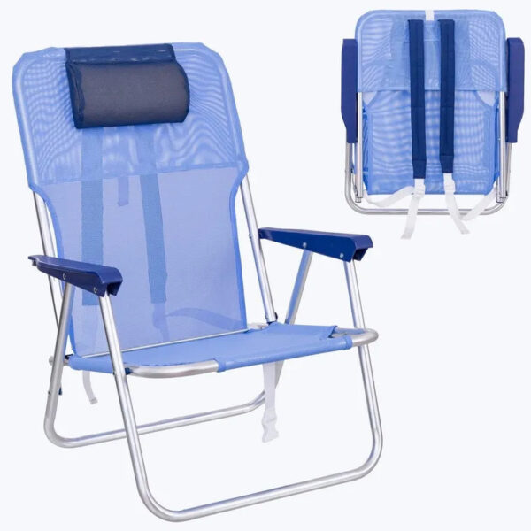 • Silla plegable con brazos de 38x32x53cm. Estructura de metal con asiento de polyester y apoyabrazos de plástico.